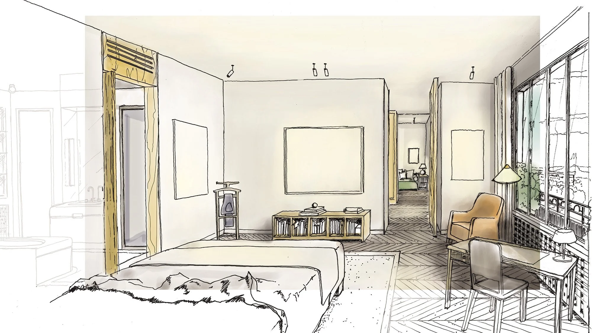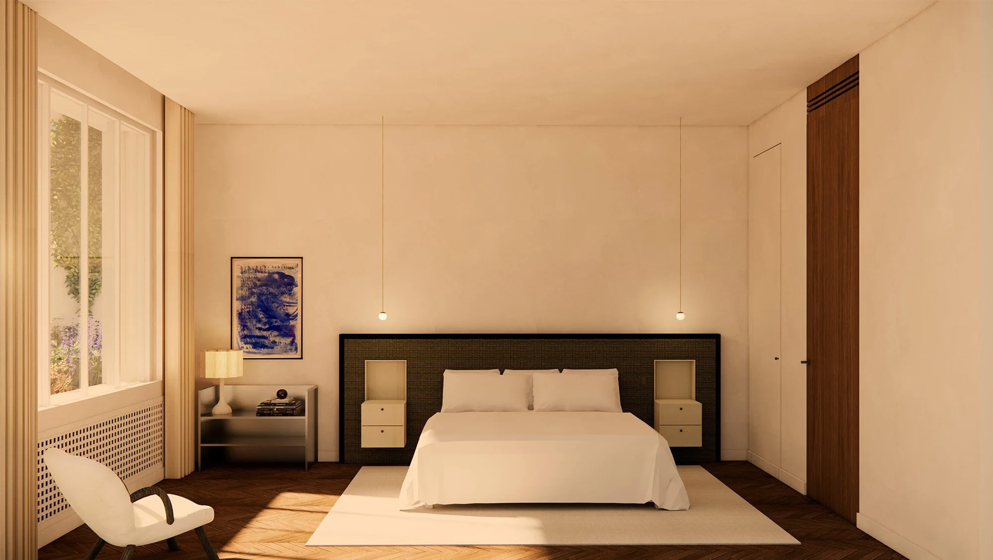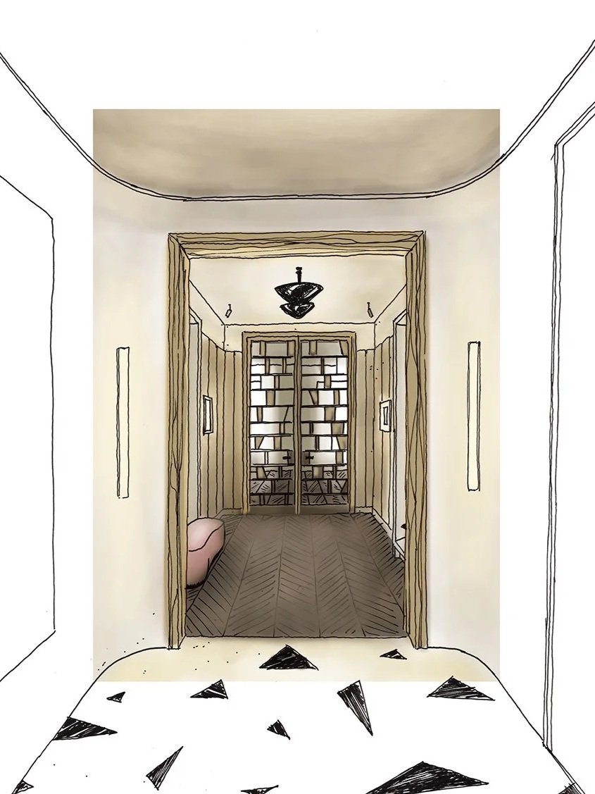Le projet restaure l’esprit initial à travers des détails soignés : réinterprétation du parchemin, restauration du parquet Point de Hongrie et remplacement des huisseries par des profilés fins en acier. À l'étage, la suite maître est pensée comme un sanctuaire avec un salon au cœur du dressing.