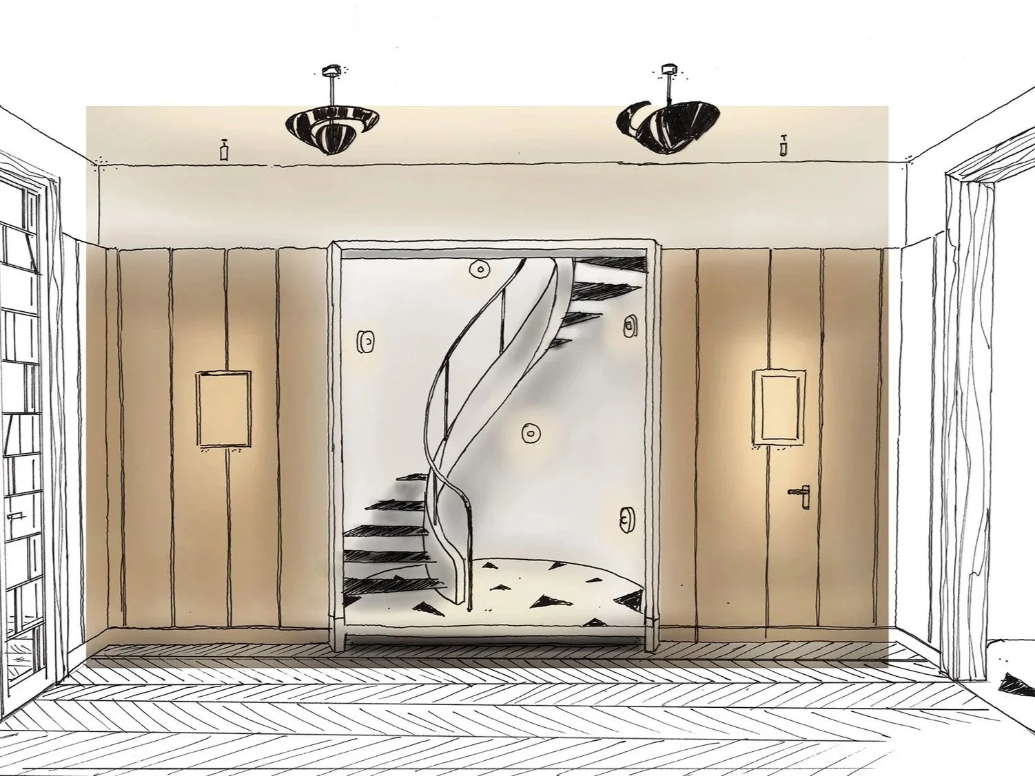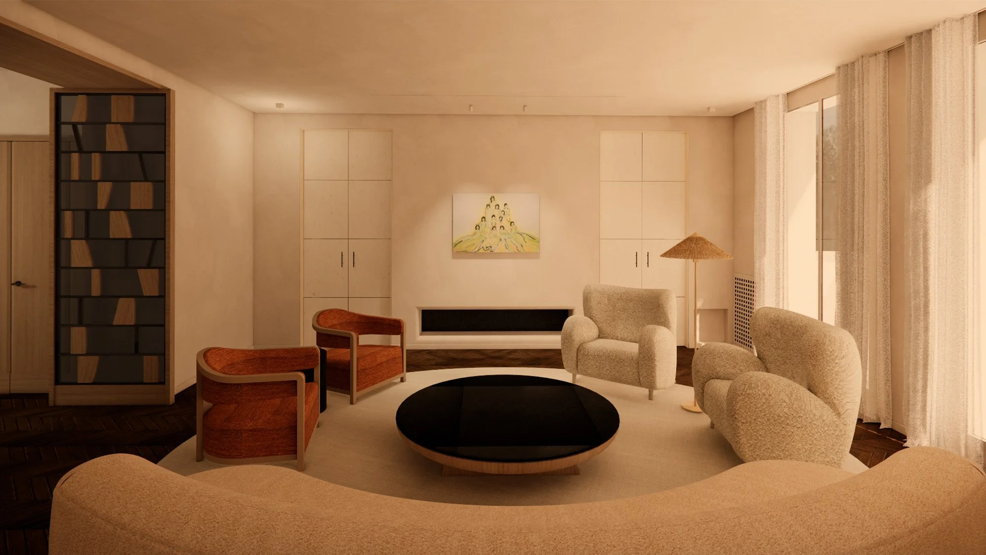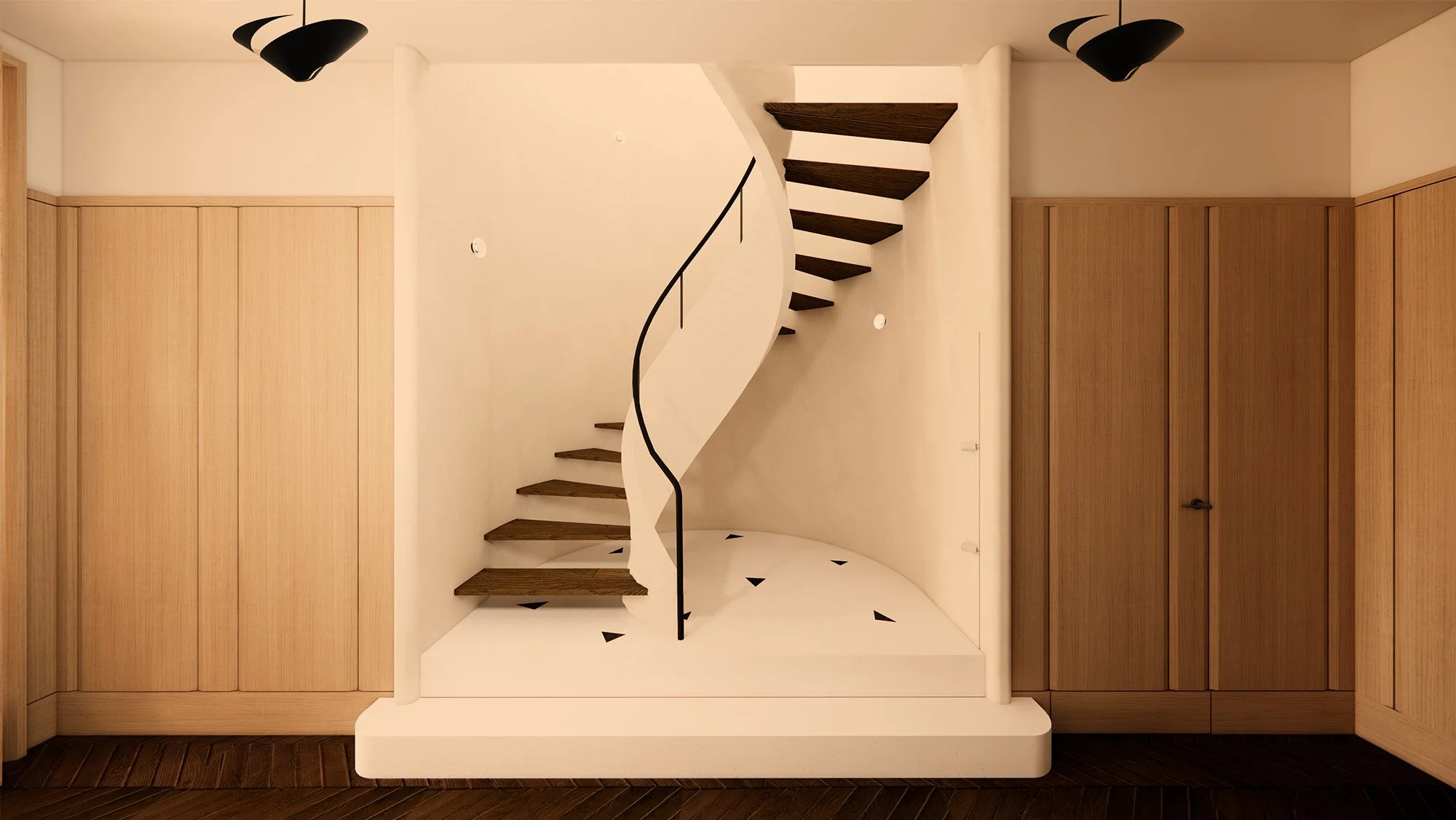 Le projet restaure l’esprit initial à travers des détails soignés : réinterprétation du parchemin, restauration du parquet Point de Hongrie et remplacement des huisseries par des profilés fins en acier. À l'étage, la suite maître est pensée comme un sanctuaire avec un salon au cœur du dressing.