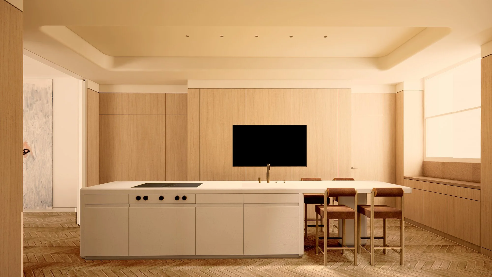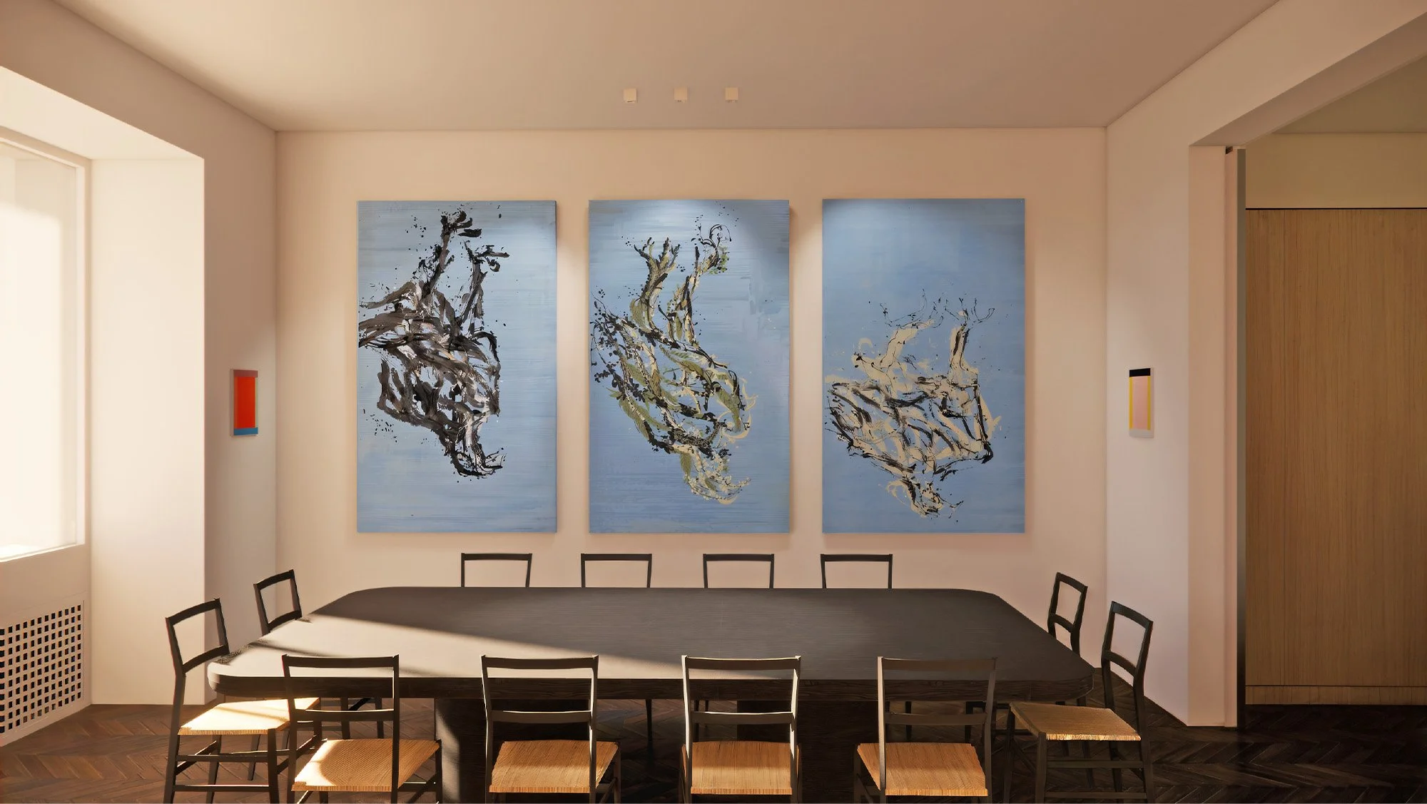 Notre parti pris a été de concevoir un intérieur minimaliste, prêt à dialoguer avec les œuvres, tout en soulignant les détails soignés de l’architecture originelle. Le décloisonnement de l’escalier, désormais structure sculpturale en acier noir, redonne une place centrale à la circulation. La création d'une galerie d’entrée en boiserie de chêne naturelle et l'ouverture de la cuisine sur la salle à manger adaptent l’espace aux modes de vie actuels de cette famille.